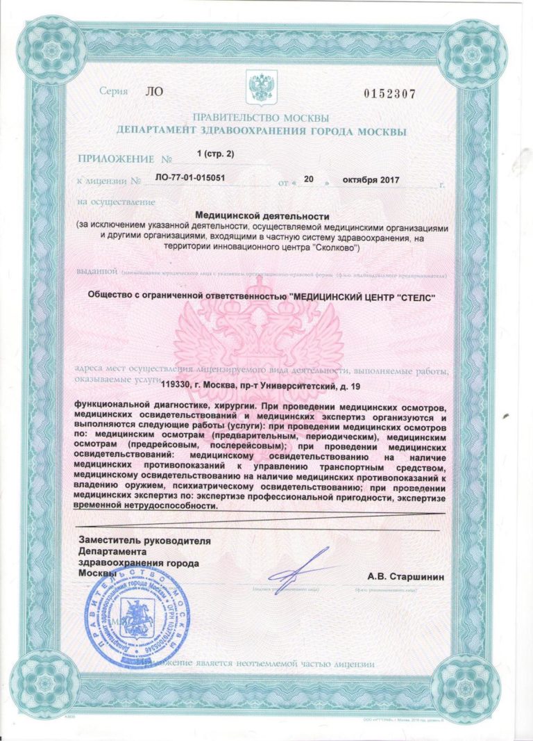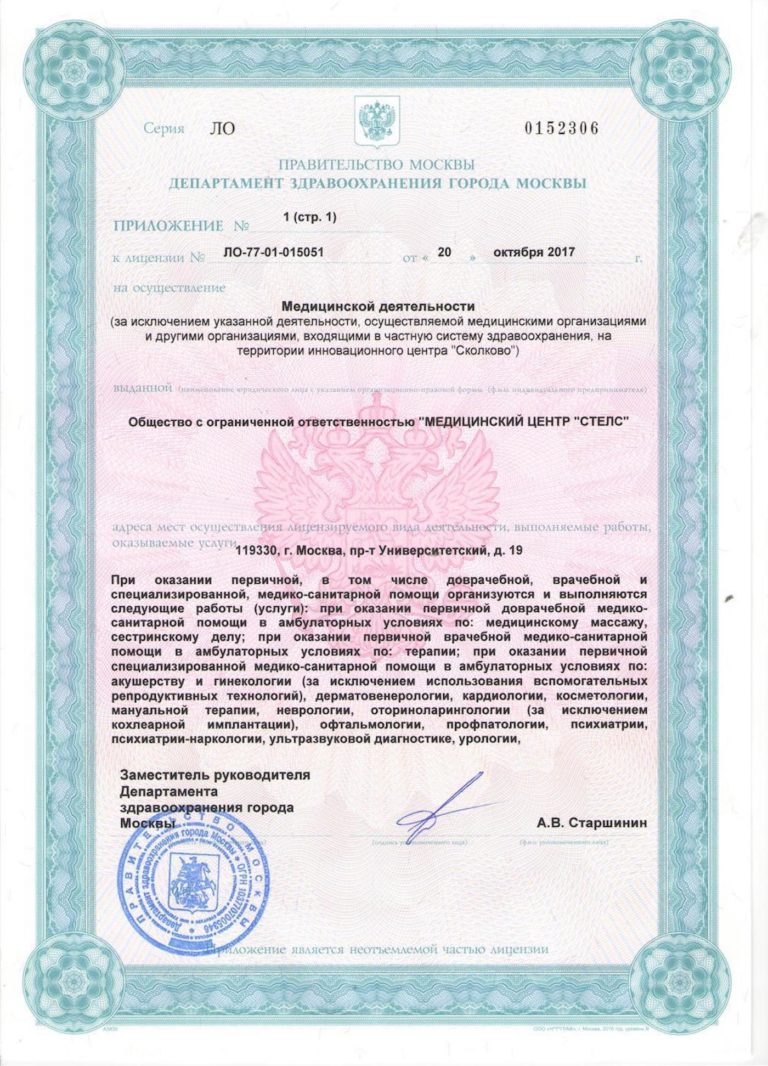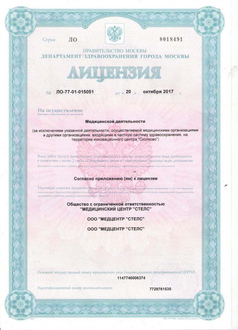 Выбирая поставщика медицинских услуг, следует отдавать предпочтение лишь лицензированным организациям. Современный медицинский центр «СТЕЛС» подтверждает правомерность своей деятельности лицензиями установленного образца, которые выданы Департаментом здравоохранения города Москвы.