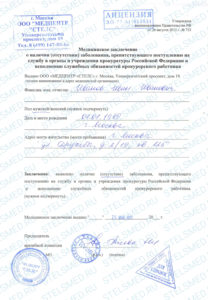 Стоимость всех исследований и оформление медицинского заключения о наличии (отсутствии) заболевания, препятствующего поступлению на службу в органы и учреждения прокуратуры Российской Федерации и исполнению служебных обязанностей прокурорского работника, по форме, утвержденной постановлением Правительства Российской Федерации от 26 августа 2013 г. № 733, составит 4500 рублей.